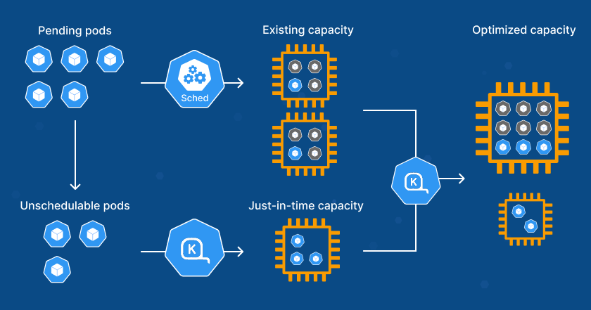 While Kubernetes manages our containers, Karpenter optimizes the resources themselves by scaling our nodes based on demand. Here’s how it works: